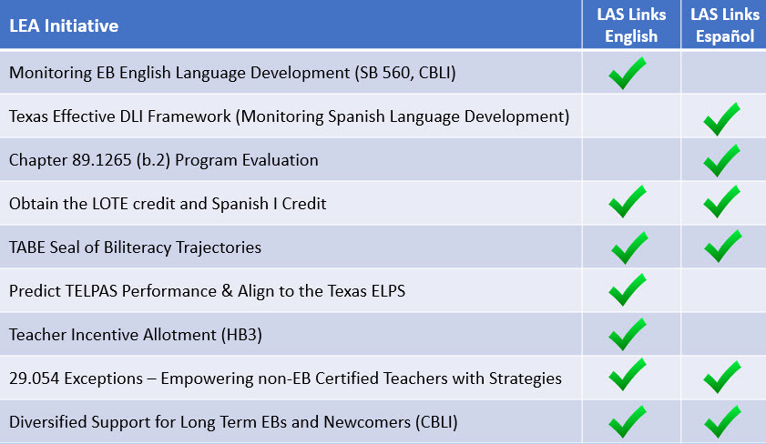 Through our work with TEA and directly with the ESCs and LEAs, DRC recognizes that LAS Links is uniquely positioned to support many of TEA’s EB initiatives with our interim assessments. The links below will show how LAS Links supports the following initiatives: